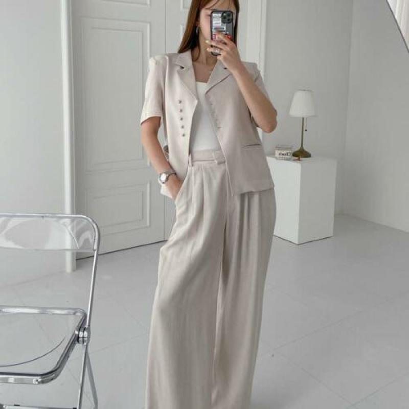 여자 린넨 사선 버튼 마자켓 슬랙스 세트