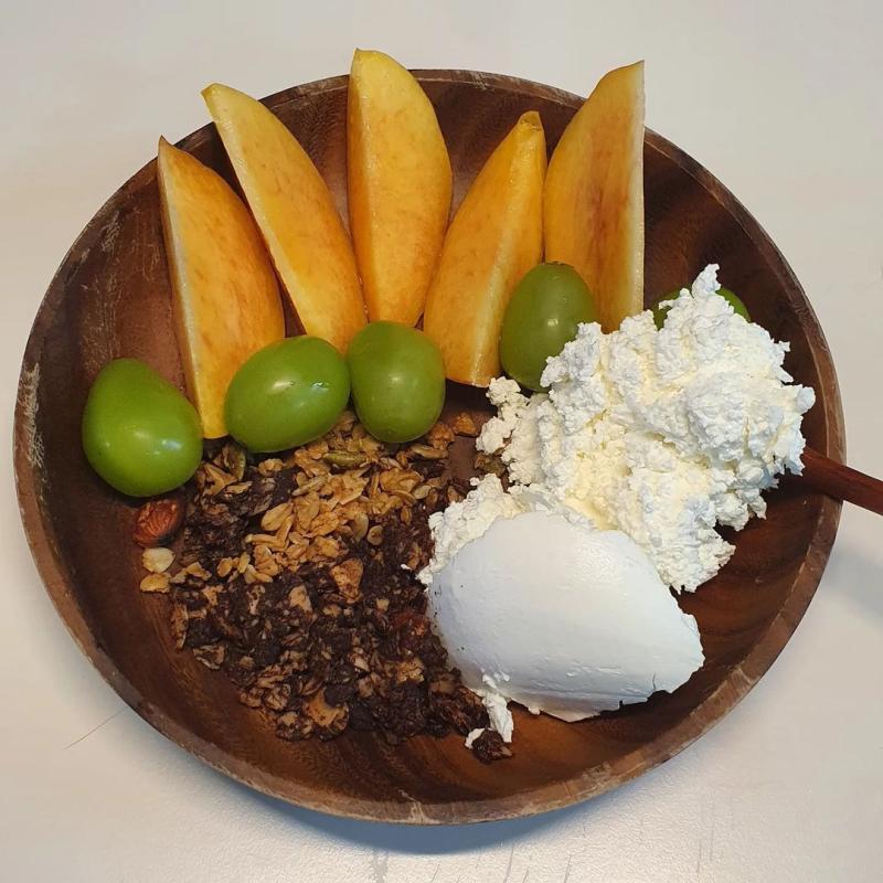 아침: 그릭요거트 그래놀라 복숭아 샤인머스켓